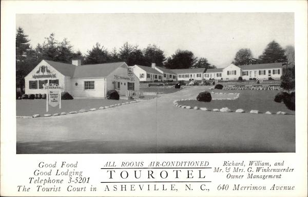 Front: COURT Good Food Good Lodging Telephone 3-5201 The Tourist Court in A S H E V I LL E, N. C., Richard, William, and Mr. & Mrs. G. Winkenwerder Owner Management ALL ROOMS AIR-CONDITIONED ΤOUROTEL 640 Merrimon Avenue Back: 750 TWO aset Bt