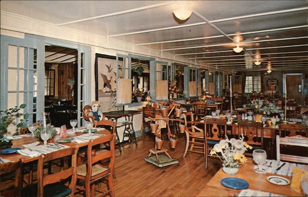The Dining Room of The Dog Team 4 miles north of Middlebury, Vermont off U.S. Route 7. Famous for real Vermont food. Antique yarn winders are used to serve relishes. Reservations only for Easter and Mother's Day. Closed every Monday.