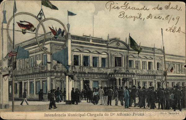 Front: Rio Grande do Sul, Brazil, Dec. 8/09 ASA Intendencia Municipal-Chegada do Dr. Affonso Penna Phot. Teixeira Back: Casa Miscellanea Rio Grandense Illmo Snr. Cartão Postal. Mrs. L. R. Churchill Warren Ares. 1909 Brockton, Mare. 6.4. A.