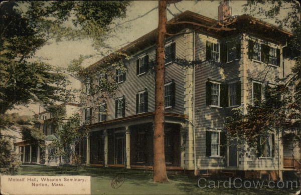 Front: Metcalf Hall, Wheaton Seminary, Norton, Mass. do Back: No. H. 12613 Pub by W. L. Stearns & Son, Mansfield, Mass In Space below may be written Sender's Name and Address. No other writing.