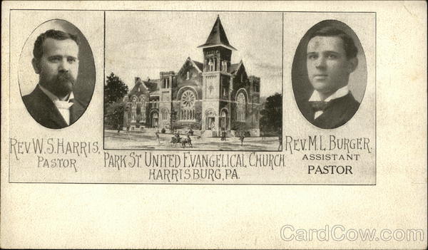 Front: REVW SHARRIS fo REV.M.L. BURGER. ASSISTANT PASTOR PASTOR PARK ST UNITED EVANGELICAL CHURCH HARRISBURG, PA. Back: Post Card