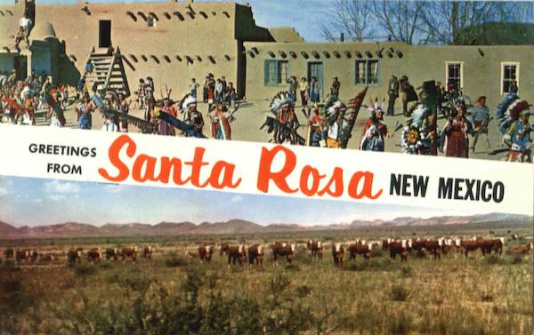 Front: די קיי GREETINGS Santa Rosa NEW MEXICO Back: VIEW GRAM P15008 Bartone-Box 175-Amarillo. Teras made in U.S.A. SANTA ROSA, N. M. on U. S. 66 is the center of livestock raising and grama grain country.