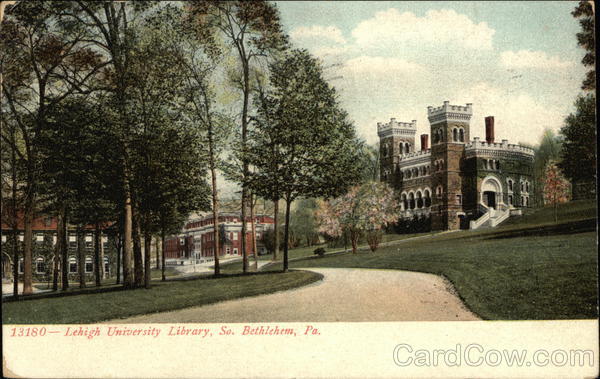 Front: 13180- Lehigh University Library, So. Bethlehem, Pa. obe T Back: Souvenir Post Card Co., New York and Berlin. 28 412-PM@ Sy 4.00⁰ VILLE 29 N. 200 8'AM NEKEN 1902 UNITED STATES OF 1706 FRANKLIN 1790 Mrs. L. M. Belier LM Titusville ng PEATS ME