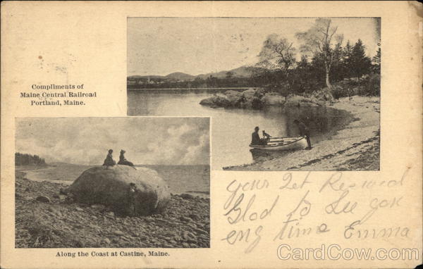 Front: Compliments of Maine Central Railroad Portland, Maine. Along the Coast at Castine, Maine. your Zet, Resword. Blod to Lee gox eng time Emma Back: Maine Central 70M NOV S 12 M MASS PRILLY 168909 Mrs Cergrid Washing hitmore mon Post