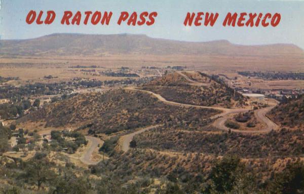 The view of the Old Raton Pass from a vantage point higher up on the Old Pass. Johnson Mesa is the background