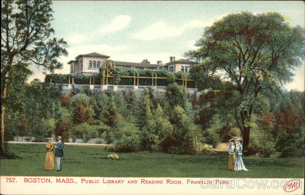 Front: ***** *}**** 380 130 FUEN AR 3452 +2459631 757. BOSTON, MASS., PUBLIC LIBRARY AND READING ROOM, FRANKLIN PARK. We Back: Metropolitan News Co. Boston, Mass. and Germany. Me TWO CENTS