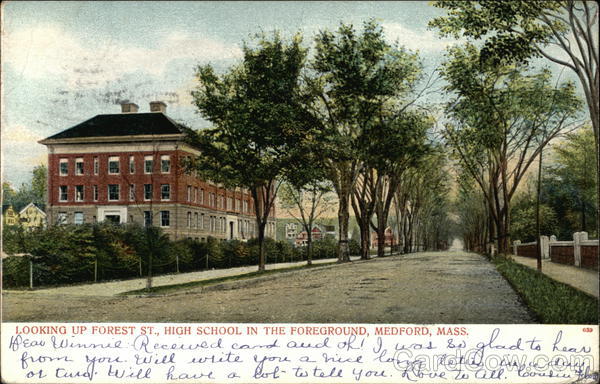 LOOKING UP FOREST ST., HIGH SCHOOL IN THE FOREGROUND, MEDFORD, MASS.