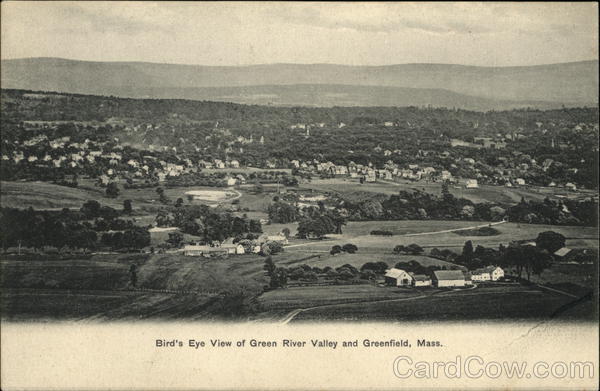 Front: Bird's Eye View of Green River Valley and Greenfield, Mass. Back: No. 3103 Published by Gaines and Freshour, Greenfield, Mass. United States, and Island Possessions, Cuba, Canada and For all other Countries 3.