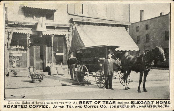 Front: APAN airea LAPAN #0 Get the Habit of having us serve you with the BEST OF TEAS and our ELEGANT HOME ROASTED COFFEE. JAPAN TEA AND COFFEE Co., 308 BROAD ST., HARRISBURG, PA. Back: TWO CENTS