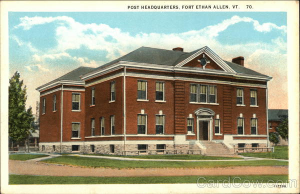 Front: POST HEADQUARTERS, FORT ETHAN ALLEN, VT. 70. 117709 Back: . را PUBLISHED BY C. W. HUGHES & CO., INC., MECHANICVILLE, N. Y. od 12, 1940 Ed Lena usartal C. T. AMERICAN ART COLORED STAR QUALITY Go CHIC