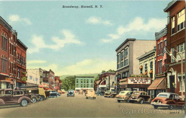 Front: Broadway, Hornell, N. Y. MaTestic FRANA BUCLS NG EN BAC ALDE SANS OF AAE a9663-N Back: GENUINE CURTEICH-CHICAGO C.T. AMERICAN ARTPOST CARD (REG. U.S. PAT. OFF.)
