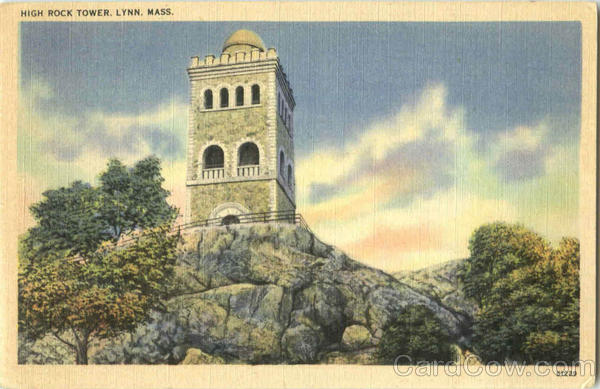 Front: HIGH ROCK TOWER. LYNN, MASS. CHIA 51229 Back: MADE IN U. S. A "TICHNOR QUALITY VIEWS REG. U.S. PAT. OFF. MADE ONLY BY TICHNOR BROS. INC., BOSTON, MASS