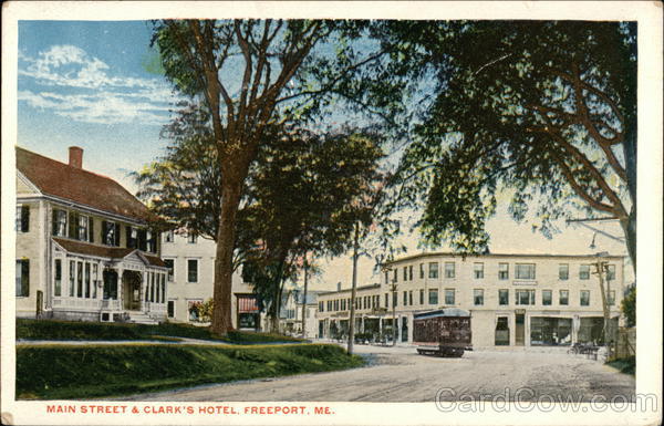 Front: FI 16 MAIN STREET & CLARK'S HOTEL, FREEPORT, ME. TE 13 7 Back: Pub. by Walter V. Cole, The Rexall Store, Freeport. Me. TWO CENTS