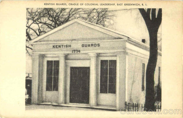 Front: KENTISH GUARDS, CRADLE OF COLONIAL LEADERSHIP, EAST GREENWICH, R. I. KENTISH GUARDS 1774 Back: PUB BY BERGER BROTHERS. PROVIDENCE, R1