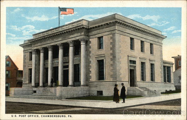 Front: U.S. POST OFFICE, CHAMBERSBURG, PA. Back: PUBLISHED BY LOUIS KAUFMANN & SONS BALTIMORE, MD. Lo K. & Sons Baltimore. od A-35660 Z. CEO CHICAGO AND ISLAND POSSESSIONS, CUBA, CANADA AND MEXICO FOR FOREIGN