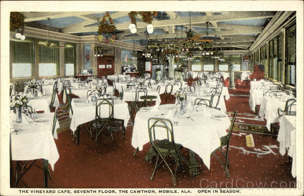 THE VINEYARD CAFE, SEVENTH FLOOR, THE CAWTHON, MOBILE, ALA. OPEN IN SEASON.