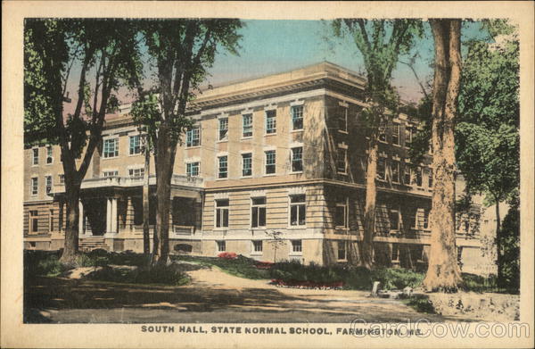 Front: TIN SOUTH HALL, STATE NORMAL SCHOOL, FARMINGTON, ME. Back: MADE IN FRANCE HAND COLORED Published by Tarbox & Whittler, Farmington, Me. VAY MERE