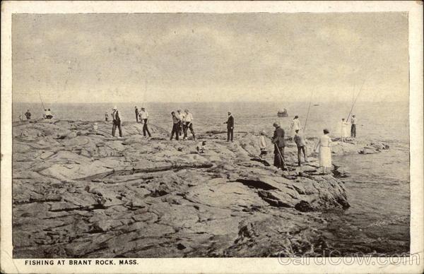 Front: FISHING AT BRANT ROCK, MASS. Back: 300 PUBLISHED BY PETERSON'S, BRANT ROCK, MASS. MADE IN U. S. A. Post Gard UN PM FRANKLIN 1938 Jackson bought the Pahard Fit Suckis big bass today Geundra 50 stilltop Ove Serington mass RO ST TEAD IN POSTAGE