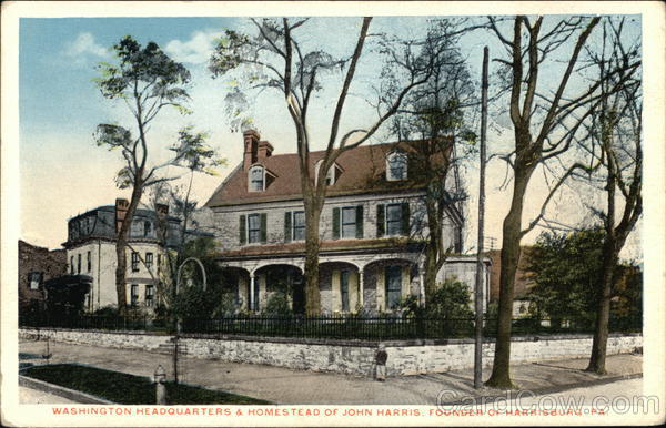 Front: 14 WASHINGTON HEADQUARTERS & HOMESTEAD OF JOHN HARRIS, FOUNDER OF HARRISBURG. PA. Back: Pub. by Union News Co., New York City. He REA'STERED TWO CENTS