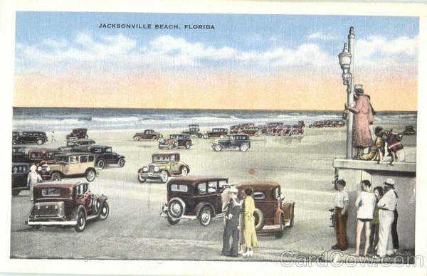 | Jacksonville and Atlantic Beaches are among the finest in the world. The sand is so white and hard that the heaviest automobile leaves but a faint outline of its tire treads; the surf so enjoyable and the water so tempered that there are few days of the year when bathers are not seen on the beaches. Auto races on the beach are events on nearly every legal holiday |