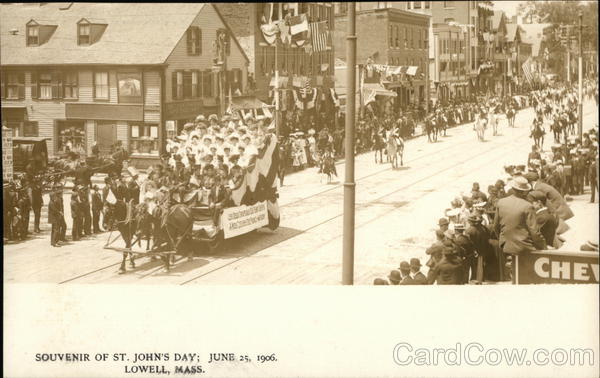 Front: FIE-GIRL JULY 2 LASE TIE GIRL ST.1 JULY 2ATERI E GIRL 24 HAVER OSGOODS DRUG STORE OHLST PRICES DR. GEO.C.OSGOOD. APOTHECARY SOUVENIR OF ST. JOHN'S DAY; JUNE 25, 1906. LOWELL, MASS. HAR CHE Back: & fo HERE