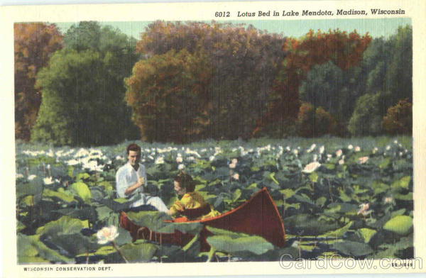 Front: 6012 Lotus Bed in Lake Mendota, Madison, Wisconsin 5B-HB49 WISCONSIN CONSERVATION DEPT. Back: *C.T.ART.COLORTONEFES U.S. FAT. OFF