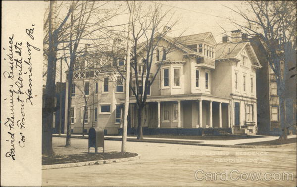 Front: David Filemings residence. Cor Trout & Routledt's Hamsbeing Pac HARRISBURG FA FLEMING-RESIDENCE 20 *3) Back: 4205 AZO + N STAMP 10 O HERE AZ O <NO -> NAME AND ADDRESS HERE