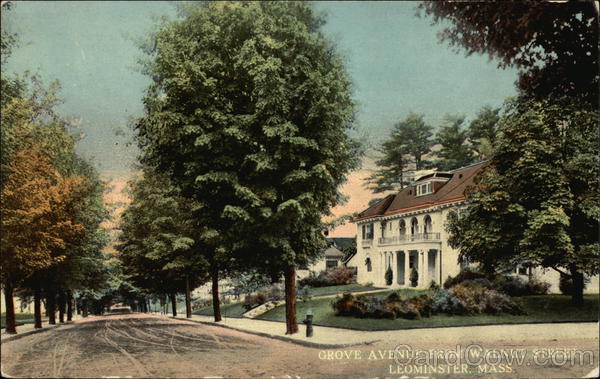 Front: GROVE AVENUE FROM WALNUT STREET LEOMINSTER, MASS. Back: POST W CARD MESSAGE MAY BE WRITTEN ON THIS SIDE. R-25540 and Island Possessions Cuba, Canada and For Foreign.