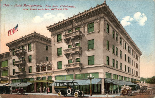 Front: 3162- Hotel Montgomery, San Jose California. COR. FIRST AND SAN ANTONIO STS. OVES & RANGES ye EXNERY HOTEL MONTGOMERY. 111110 11 111 Back: PUB BY SOUVENIR PUBLISHING CO. SAN FRANCISCO >1¢ FOREIGN 2¢ THIS SPACE FOR ADDRESS ONLY