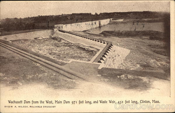 Wachusett Dam from the West, Main Dam 971 feet long, and Waste Weir, 452 feet long, Clinton, Mass.