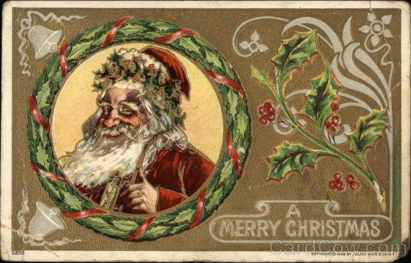 Front: 5202 MERRY CHRISTMAS COPYRIGHTED 1908 BY ULIUS BIEN & CO. N.Y. Back: NUMBER 520 CHRISTMAS 9 PM POST CARDS Downe THIS SPACE MAY BE USED FOR WRITING Kenneth poin. DECES PA MASS S.P.STAGE Willie Hinkley Holliston, My ass.