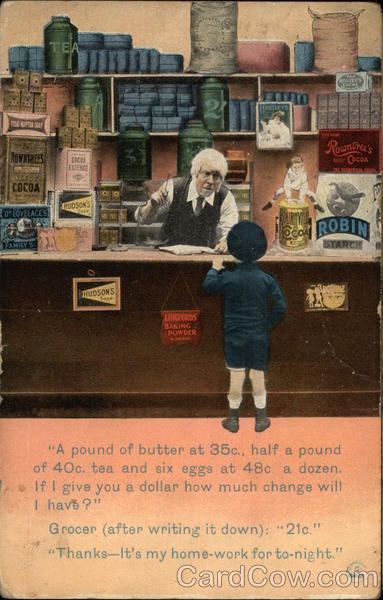 Grocer (after writing it down): "21c."