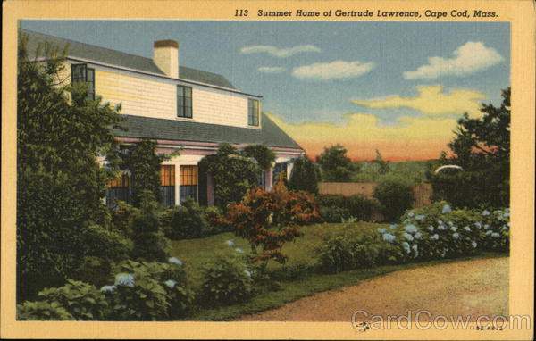 Front: 113 Summer Home of Gertrude Lawrence, Cape Cod, Mass. 5B-H872 Back: DISTRIBUTED BY E. D. WEST CO., SOUTH YARMOUTH, CAPE COD, HASS. Located in East Dennis just off Route 6. POST ČARD