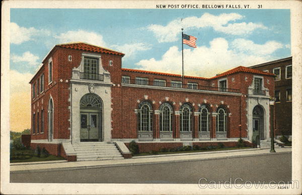 Front: NEW POST OFFICE, BELLOWS FALLS, VT. 31 2 A 367 Back: PUBLISHED BY C. W. HUGHES & Co., INC., MECHANICVILLE, N. Y. C. T. AMERICAN ART COLORED STAR QUALITY T. CM