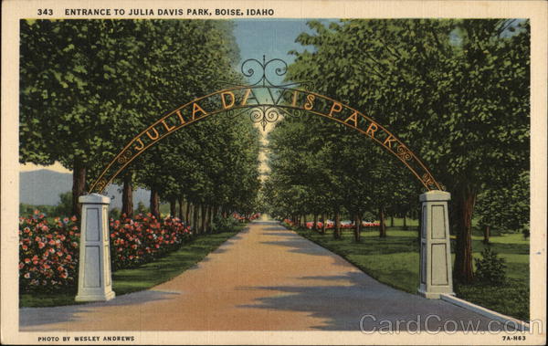 Front: 343 ENTRANCE TO JULIA DAVIS PARK, BOISE, IDAHO DA ES PAR Kge COUULIA PHOTO BY WESLEY ANDREWS 7A-H63 Back: WESLEY ANDREWS CO., PORTLAND, ORE. "C.T. ART-COLORTONEā REG. U.S. PAT. OFF. 200