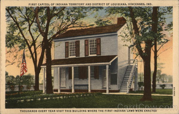 Thousands Every Year Visit This Building Where the First Indiana Laws were Enacted. This building was occupied by the Territorial Government and was situated on the south side of Main Street between Second and Third Street. About 100 years ago it was moved to Third Street near Harrison Park and used as a residence. In 1919 the Fortnightly Club of Vincennes, through public donation, purchased the building and moved it to its present site in Harrison Park where it now stands in its original condition. The upper floor was the meeting place of the legislative body and the lower was occupied by the governor and the secretary of the Territory. Curt Teich & Co. |