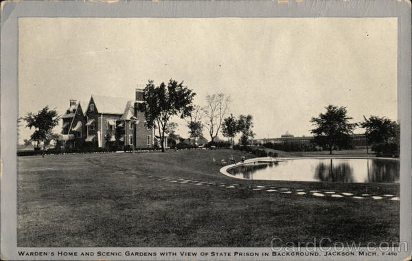 Front: WARDEN'S HOME AND SCENIC GARDENS WITH VIEW OF STATE PRISON IN BACKGROUND, JACKSON, MICH. F-490 Back: VIEW CLEAR MFD. BY WAYNE PAPER BOX & PRTG. CORP., FORT WAYNE, IND TAMP