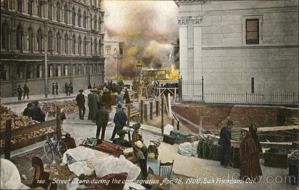 Front: 11 CE SARK A1 YAN 160 Street Scene during the conflagration Apr. 18, 1906, San Francisco, Cal. Back: (59560) I. Scheff & Bros., Publishers, San Francisco, Cal. Made in Germany. Post Card