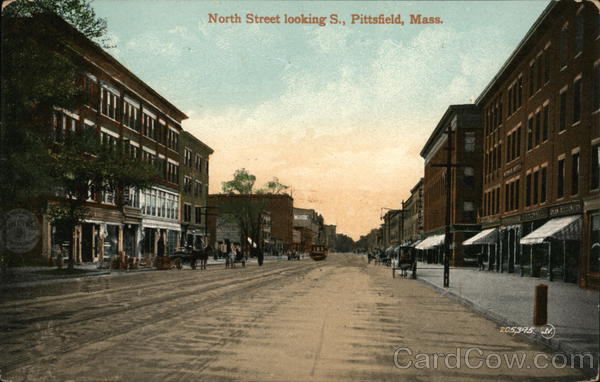 Front: North Street looking S., Pittsfield, Mass. GWO MUSIC. KONITZ 205375 N Back: The Valentine & Sons' Pub. Co., Ltd., New York and Boston THROUGHOUT THE WORLD. SNOS, 8 FA CARD. FAMOUS