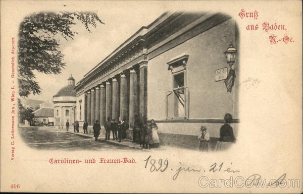 Front: Gesetzlich deponirt. Verlag C. Ledermann jun., Wien I. - 406 31 PREC Carolinen- und Frauen-Bad. Onfels Gruß 1899. jun. 21 en aus Baden, N.- Se. B.A. Back: An Correspondenz-Karte. in 792