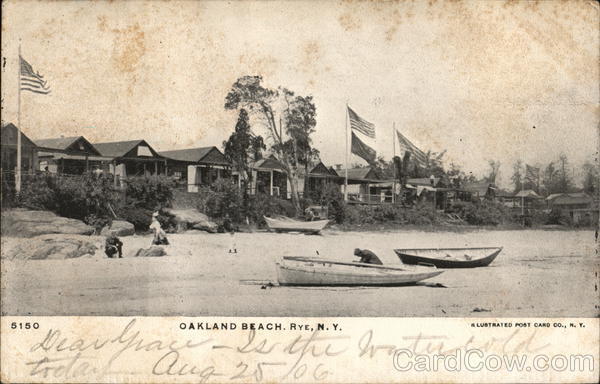 Front: ii 5150 ILLUSTRATED POST CARD CO., N. Y. OAKLAND BEACH. RYE, N. Y. "Dear page _ Is the water cold 25 6 Back: YEIN AUG27 AY POST CARDAM 1906 UNITED STATES OF Mul ANTEREICA FRANKLIN 1790 STAGE Miss Grace A Brgant So ve Mount Vernon в ус