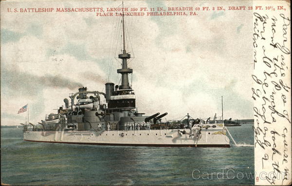 U.S. BATTLESHIP MASSACHUSETTS, LENGTH 350 FT. 11 IN., BREADTH 69 FT. 3 IN., DRAFT 23 FT. 102 IN.,