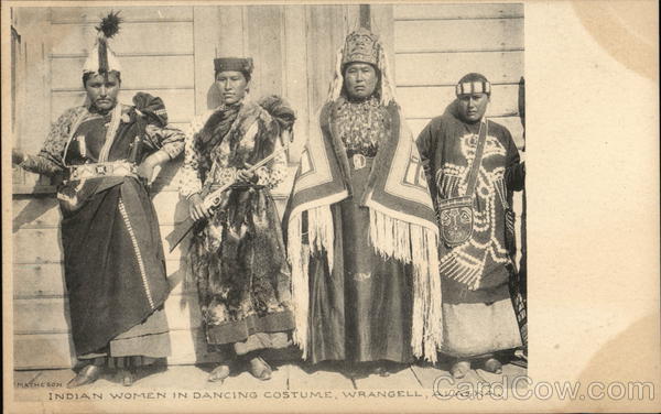 Front: MATHESON INDIAN WOMEN IN DANCING COSTUME, WRANGELL, ALASKA. Back: Domestic 1 Ct. Foreign 2 Cts. THE ALBERTY PE GO.! BROOKLYN, N.Y.