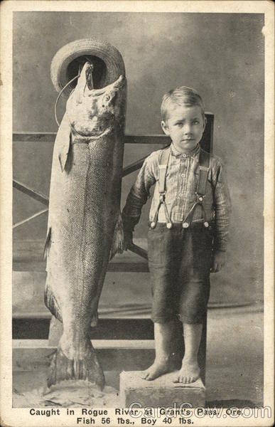 Front: Caught in Rogue River at Grant's Pass, Ore. Fish 56 lbs., Boy 40 lbs. Back: Auburn Post Card Mfg. Co., Auburn, Ind. Made in U. S. A.