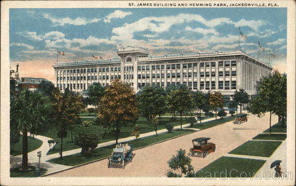 Front: ST. JAMES BUILDING AND HEMMING PARK, JACKSONVILLE, FLA. 1 Back: 22. LORIDA PUB BY THE H. & W.B & Drew Jacksonville Fla. M 1698 ARTISTIC R-31115 FOR CORRESPONDENCE ONLY 1- 100