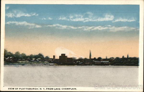 Front: VIEW OF PLATTSBURGH, N. Y, FROM LAKE CHAMPLAIN. Back: Pub. by W. B. Jaques Drug Co., Plattsburgh, N. Y. ID 2 THIS SPACE FOR ADDRESS ONLY.