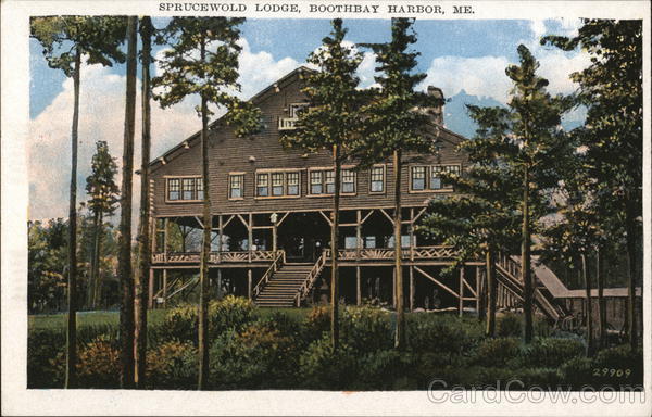 Front: SPRUCEWOLD LODGE, BOOTHBAY HARBOR, ME. fill 27 VAX 29909 Back: Pub. by "That Red Dragon Shop", Boothbay Harbor, Me. HADEMUSA 1.50 Place the Stamphere and Island Possessions Cuba, Canada and for Foreign.