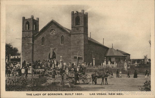 Front: THE LADY OF SORROWS, BUILT 1801. LAS VEGAS, NEW MEX. $ Back: Pub. by C. W. Fuller, Long Beach, L. I. Post Cards of Quality. The Albertype Co., Brooklyn, N. Y. CARD