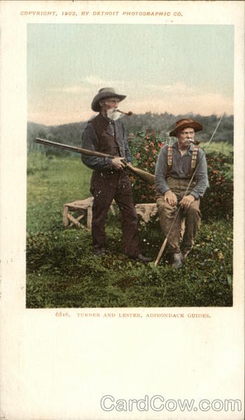 Front: COPYRIGHT, 1902, BY DETROIT PHOTOGRAPHIC CO. 6816. TURNER AND LESTER, ADIRONDACK GUIDES. Back: AND CANADA, FOREIGN, Two CENTS.