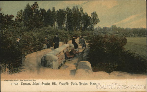 Front: Copyright 1905 by the Rotograph Co. G 7026 Terrace, School-Master Hill, Franklin Park, Boston, Mass. Back: The Rotograph Co., N. Y. City. (Germany.) Two cents